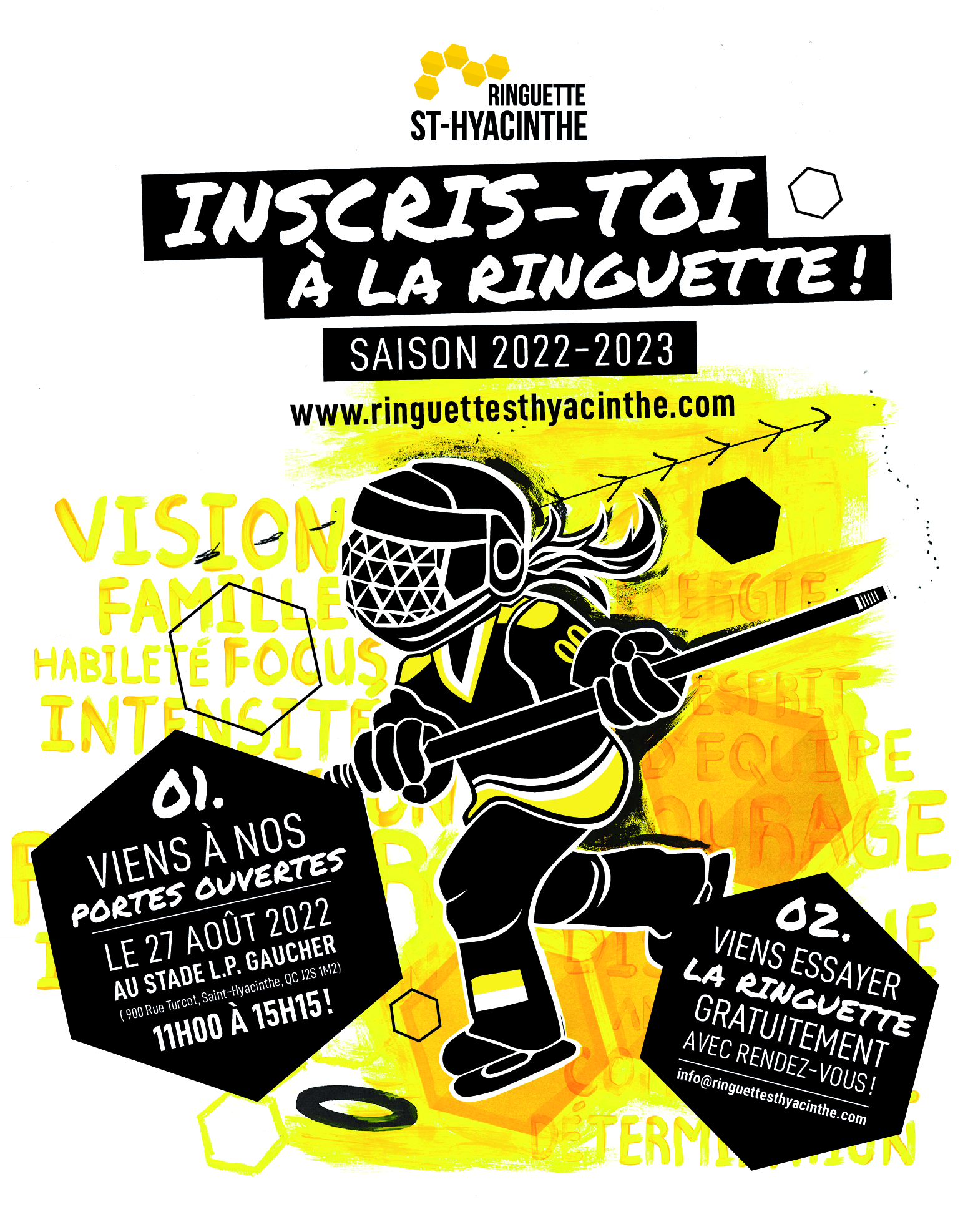 L’Association de Ringuette de Saint-Hyacinthe recherche de nouvelles joueuses pour la saison 2022-2023. Apporte tes gants, ton casque et tes patins et viens essayer la ringuette avec nous! Samedi le 27 août de 11h00 à 15h15. Pour toutes les filles de 3 à 12 ans! Vous n'avez pas d'équipements? Pas de problème, vous pouvez aller faire un tour chez notre partenaire, Sports aux puces Saint-Hyacinthe au 3050 rue Choquette, ils pourront vous aider.