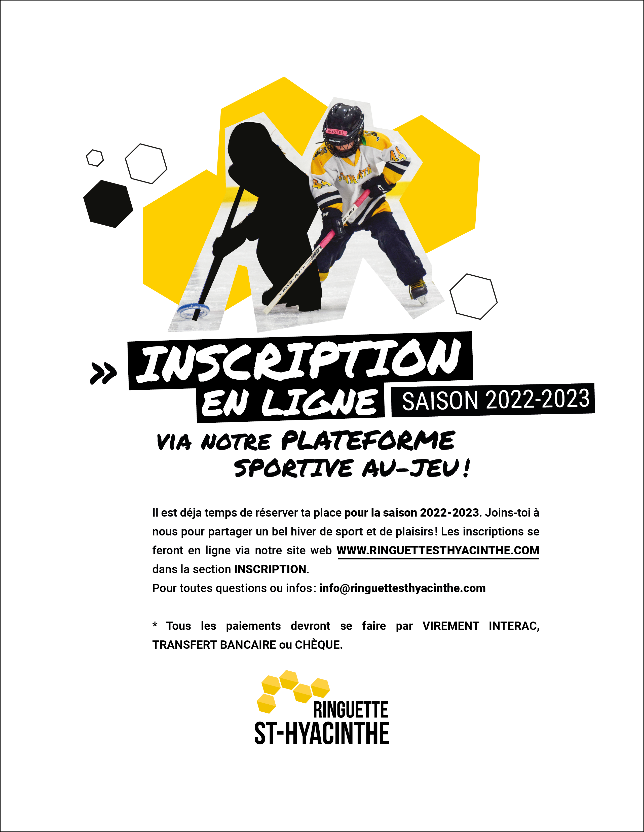 Les inscriptions sont maintenant ouvertes! Et oui!!! Il est déjà temps de réserver ta place pour la saison 2022-2023. Joins-toi à nous pour partager un bel hiver de sport et de plaisirs ! Les inscriptions se feront en ligne via notre site web. Si votre inscription est faite ainsi que le dépôt avant le 31 mai prochain, vous aurez droit à 50$ de rabais. Cette année, nous revenons au mode d’avant la Covid, soit un paiement de dépôt de 100$ et un autre pour la balance en date du 1er novembre. Il est également possible de payer le tout en une seule fois. Pour toutes questions ou infos : info@ringuettesthyacinthe.com