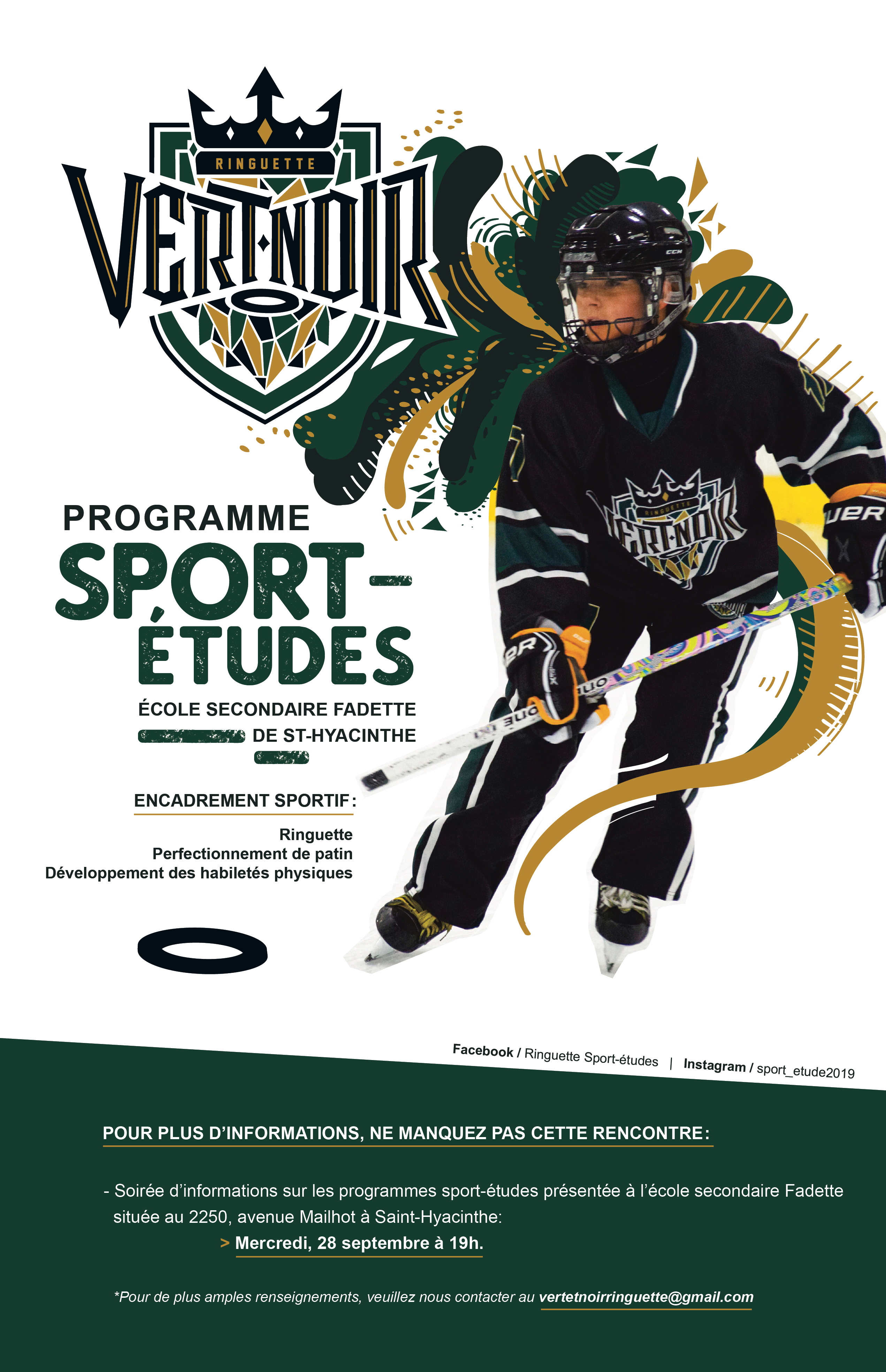 POUR PLUS D’INFORMATIONS, NE MANQUEZ PAS CETTE RENCONTRE : Soirée d’informations sur les programmes sport-études présentée à l’école secondaire Fadette située au 2250, avenue Mailhot à Saint-Hyacinthe. Mercredi 28 septembre à 19h. *Pour de plus amples renseignements, veuillez nous contacter au vertetnoirringuette@gmail.com