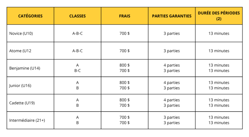 Des périodes chronométrées de 13 minutes pour toutes les catégories et classes.