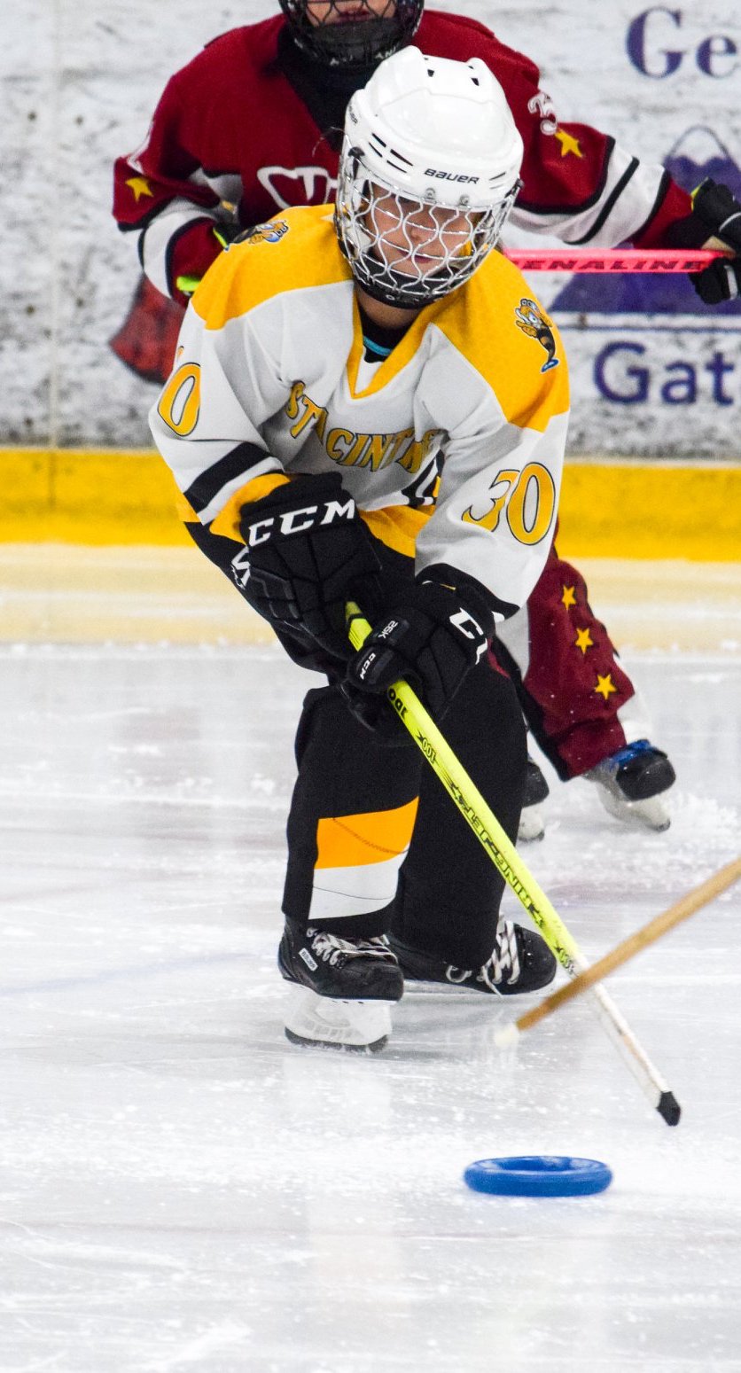 Nous jouons à 3 contre 3 dans les zones offensives / Vous remarquerez que des lignes de jeu libre (de petites lignes rouges en haut des cercles) sont tracées sur la patinoire. Entre cette ligne et l’extrémité de la patinoire, le jeu se joue à 3 contre 3. Les joueurs peuvent permuter en entrant et sortant des zones de jeu libre, ce qui produit beaucoup de mouvement et engendre de la créativité. Nous portons de l’équipement protecteur / Les joueurs doivent porter un protège-cou, des coudières et des genouillères, des protège-tibias, ainsi que de l’équipement protecteur des hanches et du coccyx. Le port du casque avec protecteur facial intégral est obligatoire. Ces protecteurs faciaux doivent être munis de barres triangulaires ou horizontales qui empêchent le bâton d’y pénétrer.